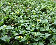 The opposite leaves are typically 1–3 cm (0.39–1.18 in) long and triangular to lanceolate in shape.[4][5] It bears heads of yellow flowers, with around 10–20 disc florets and 3–8 ray florets, the laminae of the latter around 2–5 mm (0.079–0.197 in) long. It flowers year round.[4] It is a weedy species, found in lawns and along other disturbed areas such as roadsides and paths.[4]
