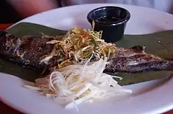 There are more than 900 different freshwater and saltwater fish species found in Cambodia. Approximately 475,000 tons of fish (ត្រី, trei) are caught in Cambodia every year and a Cambodian annually consumes 63 kg of fish on average. They are fried, dried, smoked and fermented into prahok and fish sauce. Fish and fish products are eaten two to three times a day.[55] Popular fish are snakeheads, snappers, catfishes (ត្រី, trei chleang), and mackerels.[9] Cambodian chef Luu Meng has estimated that approximately 40–50% of Cambodian dishes are made with fish.[78]