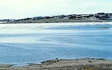 A Distant Early Warning Line site was established in 1955 and about 200 Inuit were hired to help in the construction.[26] The military presence and the services and economy this represented acted as a magnet for Inuit who had previously used the area as a temporary site for meeting, hunting, fishing and trade, and a permanent community was soon established across the bay in its current location.[26] Unlike the majority of the DEW Line radar sites which were abandoned or automated, this site which changed in 1989, known as CAM-MAIN, remains a manned operation, with about 18 people, as part of the North Warning System.[32][33]