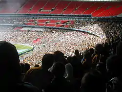 Cambridge finished Ling's first season in 10th place – not enough for a playoff place.[37] The following season, on 6 January 2011, with Cambridge in a similar position to where they finished the previous season, the club's owners put the club up for sale citing the need for new funds to take the club forward.[38] Despite interest being expressed from a number of parties, no new owner has yet been found.[39] Later the same month, the club's landlords Grosvenor Group revealed the plans for a new community stadium, including potential new locations both within the city and outside it.[40] At the start of 2011 Martin Ling was removed from his position as manager[41] and replaced on a temporary basis by CRC manager Jez George.[42] He managed to steer the club towards safety, finishing 17th, which led to George's role being made permanent. After having rebuilt the squad with players from the club's youth system and with astute signings in Harrison Dunk and Tom Shaw, George managed to lead Cambridge to a 9th-place finish, a huge improvement on their previous season. As well as the league, Jez George also took Cambridge to the quarter-final of the FA Trophy (which was the furthest they had reached at the time), but lost 2–1 at home to minnows, Wealdstone.[43] Eleven games into the following season Jez George became Director of Football, and Richard Money was announced as the new head coach of the club.[44] The club spent much of the season in mid-table, finishing in 14th position with 59 points. The squad was greatly revamped, and United started 2013–14 with a record-breaking 16 games unbeaten. Cambridge finished the season in second place, qualifying for the play-offs. After beating FC Halifax Town 2–1, on aggregate, in the semi-final, they won 2–1 against Gateshead in the final, held at Wembley Stadium, gaining promotion back to the Football League after a nine-year absence.[45] The club also reached their first FA Trophy final, held at Wembley Stadium, where they beat Gosport Borough 4–0.[46]