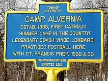 Camp Alvernia is a non-profit recreational summer camp in Centerport, New York on the North Shore of Long Island. The camp is located on the east shore of Centerport Harbor, on the Little Neck peninsula. It was founded in 1888 by the Franciscan Brothers of Brooklyn, who still run the facility now, over 130 years later.[1] Alvernia was the first and is now the oldest Catholic camp in continuous operation in the United States.[2]