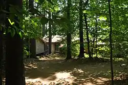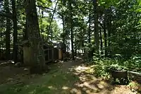 Camp Ossipee is located in eastern Holderness, on the south shore of Mooney Point, a peninsula projecting into Squam Lake's west side. It consists of two main camp buildings, four outbuildings, and a short railroad to facilitate the movement of supplies from the access road to the main buildings, which are set down a slope near the water. The older of the two camp buildings is a single-story frame structure, finished in wooden shingles and roughly shaped in a broad V. The water-facing facade is covered by a full-width screened porch which uses slender logs for support. The interior of the building is rustically finished, with a hexagonal living room at its center. The newer of the main buildings is a roughly rectangular single-story frame structure, set further back from the water to the east of the older one.[3]