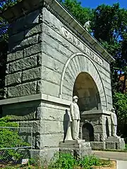 Of the original 53½ acres, a segment was set aside as Camp Randall Park in 1911.[15] The Memorial Arch was added in 1912, fifty years after the war, located where one of the camp's gates stood, where soldiers would have entered and left. It was designed by Lew F. Porter, with a statue on the left of a young Civil War recruit, and a statue on the right of an aging Civil War veteran in 1912.[2][16] The arch is topped with a statue of the mascot eagle Old Abe.[17]