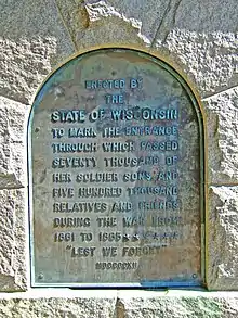 In 1971 Camp Randall Memorial Park was listed on the National Register of Historic Places as "the site most significantly associated with Wisconsin's participation in the Civil War."[2] The plaque under Memorial Arch reads: