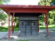 Just a few years before the war, in 1858 and 1860, the camp's flat open area on what was then the west side of Madison had hosted the Wisconsin State Fair.[6] With the outbreak of war, the Wisconsin Agricultural Society provided its fairground to be used as a training camp. Some of the new recruits bunked in what had been the State Fair's cattle sheds, while others lived in tents. The fair's machinery exhibit building was converted to a mess hall that could feed 3,000 men at a time. And the fair's Floral Hall held the hospital and officers' quarters.[5] Some fair sheds housed cavalry animals, and other buildings were constructed.[2] 45 barracks buildings were each 80 by 20 feet, with bunks three high, each housing up to 100 men.[7] An eight foot fence surrounded the 10-acre camp, with two manned gates.[5] One of those gates was where the Memorial Arch stands now.[2]
