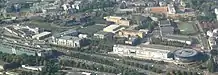 The campus is located in the southwest of the city, just to the north of the terminus of the A4 motorway. It is predominantly in the quarter of Hollerich, although the western part (including the Conservatoire) lies in Merl.[1] Shaped roughly like a right triangle, the campus measures 800 metres (880 yards) east-west along the hypotenuse, and 520 metres (570 yards) north-south at its maximum.