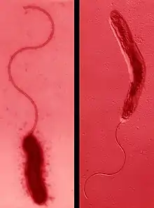 Campylobacter upsaliensis shares the characteristic appearance of other Campylobacter species: it is a curved to spiral, gram-negative rod that displays darting motility.[2][7] The bacterium either have one polar flagellum, or two flagella with one at either end, and can range from 0.2μm to 0.5μm in width and 0.5μm to 8μm in length. When grown on blood agar the colonies appear smooth, well defined, and grey to translucent.[2] C. upsaliensis is catalase negative, distinguishing it from some other Campylobacter species which are catalase positive.[8] This species is also considered thermotolerant, having been shown to grow in culture at 42 °C, and microaerophilic, generally requiring an oxygen concentration around 5%.[2][9] In addition, C. upsaliensis is oxidase positive, like many other species within the genera.[2][8][10]