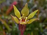 C. lineare, also known as the green mountain lily,[6][7] is a small inconspicuous erect herb that grows to 15–30 cm in height. Its leaves consist of a single, curved basal leaf, with smaller leaves ascending up the flower stem.[7] It is most distinguishable by its striking green flower, which blooms in summer.[7] The flower is usually solitary, with 6 green tepals, sometimes with a burgundy tinge and developing brown edges with age,[7] lacking apparent nectaries.[8] The anthers are dorsifixed, styluli are free but thickened and contiguous below. The seeds are numerous and are flattened, sometimes almost discoid, with a spongy outer coat.[8] It is a geophyte,[9] and its leaves are deciduous in winter.