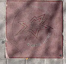 Gordie Howe's star on the Walk of Fame as of April 2009. Damage can be seen on the bottom left corner.