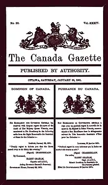 The Canada Gazette (French: Gazette du Canada) is the official government gazette of the Government of Canada.[1] It was first published on October 2, 1841.[2] While it originally published all acts of the Parliament of Canada, it later also published treaties, hearing and tribunals, proclamations and regulations, and various other official notices as required.[1] At one time it contained information on bankruptcies.[2] It has been administered by Public Works and Government Services Canada and the King's Printer for Canada since 1841. The Gazette is most often read to find new acts, regulations and proclamations.[2]