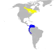 During the breeding season 82% of the population can be found in Canada and 18% in the United States.[7] In Canada, the summer range extends from southeastern Yukon to Nova Scotia. In the United States, the range extends from northern Minnesota to northern Pennsylvania, east to Long Island, New York. It also nests in the high Appalachians as far south as Georgia.[11] In winter, the Canada warbler's range extends from Guyana to northwestern Bolivia around the northern and western side of the Andean crest.[12]
