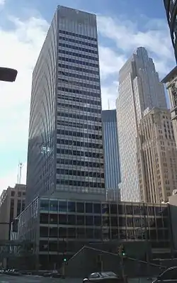 The building's history began in 1955 when First Bank System of Minneapolis hired Holabird, Root & Burgee of Chicago to design a new headquarters.[1] The project, assisted by Minneapolis firm Thorshov & Cerny, drew inspiration from the design principles of Ludwig Mies van der Rohe and the recently completed Lever House in New York City. Construction commenced with demolition of the New York Life Insurance Building in 1957, followed by a January groundbreaking in 1958, and final occupancy in May of 1960.