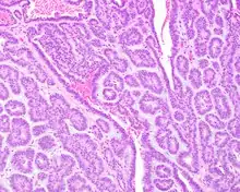 The growths often contain are often small bight squamous balls, or morules. They also tyipcally contain a well-developed supporting tissue - a fibrous stroma - which is rich in hyaluronic acid and chondroitin sulphate.[1] In a few cases, the growths may contain small calcium deposits or microliths. Although it is seldom necessary, a pathologist can confirm the existence of canalicular adenoma through immunohistochemistry studies, with the cells reacting with pancytokeratin, S100 protein and SOX10, with a delicate GFAP reaction around the periphery.[5][1][6][7] Although it is a benign tumor, a positive diagnosis of canalicular adenoma may be necessary to exclude the existence of other medical conditions such as a basal cell adenoma, pleomorphic adenoma, adenoid cystic carcinoma, and polymorphous adenocarcinoma.