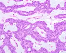 A hematoxylin and eosin stained slide of canalicular adenoma showing beading