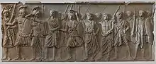 Frieze A originally depicted Domitian as he prepared to depart for a campaign against the Chatti.[6] Contemporary authors such as Suetonius later alleged that Domitian's military endeavours were largely a failure, motivated by a quest for personal glory rather than necessity.[7] The scene depicted on Frieze A seems to counter such accusations by presenting Domitian as a reluctant general, spurred on by the gods Mars, Minerva and Roma, who are pictured on the far left, to defend his home country.[8] Other characters who appear in this scene are the Genii, or guardian spirits, of the Roman Senate and the people of Rome, and a number of soldiers.