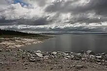 The Caniapiscau Reservoir is in the zone of discontinuous permafrost. The area surrounding the reservoir is vegetated entirely with taiga, or boreal forest, characterized by widely spaced Black Spruce with a thick underlayer of yellow-grey lichen and interspersed with muskeg and bogs. In the more moist areas, some closed coniferous forest stands may appear. On the more exposed land, a forest-tundra transition zone occurs where the woodland is replaced by lichen dominated tundra.[3]