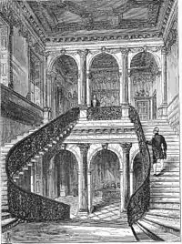The portico, railings and marble staircase with bronze balustrade were bought by the 4th Earl of Chesterfield for his new London home, Chesterfield House, South Audley Street, which was built in 1749 but like Cannons is no longer standing having been demolished in 1937.[22] Another statue modelled by C. Burchard in about 1716 and cast by John Van Nost, of George I, was moved to Leicester Square, where, after frequent vandalism, it was removed in 1872.[23]