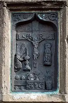 Second, a unique crucifixion plaque (1525). The crucifix scene was designed to show the mass as a re-presentation of the passion. Holmes claims: