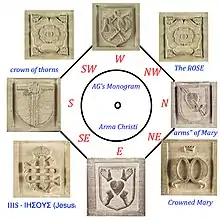 Third, a baptismal font. This can be seen in St John’s Episcopal Church, Crown Terrace in Aberdeen. The bowl is octagonal with sunken panels on each face. This design is striking when compared to other medieval fonts in Scotland.[24] The liturgical signs are as follows: the eight sides of the bowl itself are a reference to the eighth day of Holy Week – the Sunday of the Resurrection and new birth. A feature on one side of the bowl is the letters A & G intertwined with a cord.[25] There are in addition on other faces, the Arma Christi (five wounds - the objects associated with Jesus' Passion), two sacred monograms (one being “IHS” - abbreviation of the name ΙΗΣΟΥΣ (Jesus); the other a crowned M for Mary), a pierced heart (the "arms of Mary"), two carved roses and the cross with a crown of thorns. Galloway made extensive use of the Marian Rose in his liturgical signs, as well as being a practising "Marianist". The bowl, which is 18 in (46 cm) deep and 9.5 in (24 cm) wide has a drain. It now sits on a pedestal which was designed by the Aberdeen architect James Mitchell who provided the setting in 1851 when it was installed in St John's.[26]