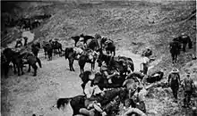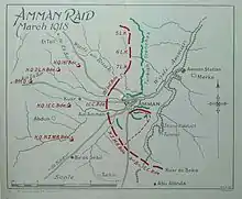 A raid on Amman was the next operation for the regiment. The ANZAC Mounted Division, 60th (London) Division and the Imperial Camel Corps Brigade would all take part.[99] On 13 March the regiment started back to the Jordan Valley through heavy rain. Orders for the raid were issued; the brigade would advance on mountain tracks, via the village of Ain Es Sir, then to Amman.[100] The rains postponed the raid, and it was not until 01:30 on 24 March that the brigade crossed the river Jordan, by a pontoon bridge at Hajlah. At 09:30 the regiment, the Wellington Mounted Rifles and the 181st (2/6th London) Brigade started clearing the area between the river and the foothills.[101] The vanguard, formed by the 1st Squadron and the Auckland Mounted Rifles, had by 16:30 left the Wadi Jeria and started up into the hills.[102] In the wet and cold weather progress was slow. The narrow tracks meant that all wheeled transport, including artillery and supply wagons, had to be left behind.[103] They reached Ain Es Sir at 14:00, two hours behind the vanguard. Out of contact with the division, they remained at the village for the remainder of that day and the next. Patrols checked the area between the village and Amman, which was around six miles (9.7 km) away. The remainder of the division, which had travelled by a different route, arrived later that day. They were in no physical condition to attack, so the advance was postponed until the next day.[104]