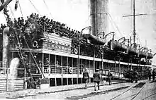 On 23 September the regiment left their camp for Lyttelton and embarked on the transport ships HMNZT Tahiti and HMNZT Athenic.[13] Leaving the same day, they arrived at Wellington the next afternoon, and disembarked the troops. On 14 October they boarded the transports again and set sail.[14] With a short stop at Hobart, on 28 October they arrived at Albany, and anchored waiting to be joined by the Australian contingent. The combined convoy sailed on 1 November and reached Colombo on 15 November. Two days later it sailed into the Red Sea, and the Suez Canal.[15] Docking at Port Said on 2 December and Alexandria the next day, the regiment disembarked on 4 December and boarded a train for their camp in the Cairo suburb of Zeitoun where they started a training programme, using the desert for manoeuvres, during both day and night.[16]