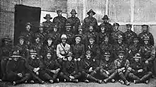 Raised on 12 August 1914, at the start of the First World War, the Canterbury Mounted Rifles Regiment came from the Canterbury region on the South Island of New Zealand.[3] Commanded by Lieutenant-Colonel John Findlay, it was composed of a headquarters, a machine-gun section and three squadrons, formed from Territorial Force regiments.[4][5] The New Zealand Territorial Force included a compulsory training system, and the four Military Districts were required to supply a mounted regiment for the New Zealand Expeditionary Force. To meet that obligation, the Territorial Force regiments each provided a squadron, which kept their own regimental badges and traditions.[6] The regiment's squadrons came from the 1st Mounted Rifles (Canterbury Yeomanry Cavalry) (1st Squadron), the 8th (South Canterbury) Mounted Rifles (8th Squadron) and the 10th (Nelson) Mounted Rifles (10th Squadron).[7] The establishment was fixed at twenty-six officers and 523 other ranks, who used 528 riding horses, seventy-four draught horses and six pack horses.[8] Each squadron, of 158 men, had a field headquarters and four troops. The Machine-Gun Section, with two Maxim Guns, had one officer, twenty-six other ranks, twenty riding horses and sixteen draught horses.[9] Even though the regiment used horses, they were not cavalry but mounted infantry, and expected to ride to the battlefield, dismount and then fight as traditional infantry.[10] Attached to, but not part of, the regiment were medical and veterinary officers, an artificer, three more other ranks and another eighteen horses.[9] The regiment was assigned to the New Zealand Mounted Rifles Brigade, serving alongside two other regiments: the Auckland Mounted Rifles and the Wellington Mounted Rifles.[11][12]