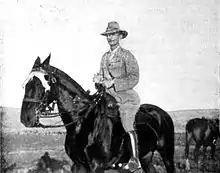 Just after midnight on 4 August the 1st and 2nd Light Horse Brigades were attacked at Romani. At 08:00, the regiment, acting as the brigade vanguard, advanced towards Dueidar; at the same time they could hear firing in the distance from Romani.[61] By 10:30 they were approaching the Turkish position on Mount Royston, and the regiment opened out to attack, with the 8th Squadron positioned on the left, the 1st in the centre, and the 10th on the right, with the Auckland Mounted Rifles following in support. The 5th Light Horse Regiment, who were supposed to be to the left of the 8th Squadron, had not yet arrived.[61][nb 2] The assault commenced at 15:00, supported by the Somerset Battery Royal Horse Artillery, and by 17:30 they had driven the Turks off Mount Royston. The brigade captured an artillery battery and over 1,000 prisoners.[62] The regiment's casualties during the battle were one dead and fifteen wounded.[51] The next day at 03:30 they moved to Katia, which was believed to be occupied by a large Turkish force. On arrival, the brigade galloped forward, attacking from the south. When they got close the regiment dismounted and continued on foot. Fighting all day, they waited in vain for the 3rd Light Horse Brigade to support the assault. Still holding their ground at 20:00, they had to retire and return to Bir et Maler to water their horses.[63] Their casualties were two dead and fifteen wounded.[51]
