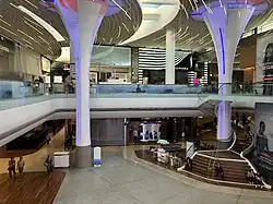 Forty luxury, premium and designer brands (such as Maison Christian Dior, Fauchon, Maison Ladurée, Chocolat Alain Ducasse) are grouped together in the "Corso" wing over 8,000 m2 located to the west of the building, on the first level.[14][15] This wing, which offers a view of the sea, is in the shape of curves supposed to recall « the movements and reflections of water ».[23] It has a high ceiling, which lets in natural light, its floor is in venetian glass, and it contains decorative elements in Murano glass and brass.[15][23]