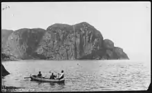 According to a legend montagnais, the cape Trinité would be the result of the combat between Mayo, the first Montagnais, and of a bad manitou. While he was paddling on the Saguenay, a creature appeared from the river to attack it. Mayo, responding only with his courage, took the creature by the tail and smashed it on the mountain. It was at the third stroke that the beast was crushed, which explains the three levels of the cape. Where the manitou hit the rock, no more vegetation grew.[2]