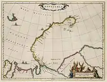 Dutch map of Novaya Zemlya with Cape Flissingsky indicated by t' Vlißinger Hooft on the Northeastern edge (Atlas van Loon, 1664)
