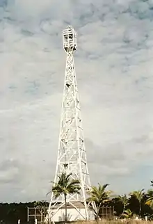In 1933-1934 a more substantial station was constructed. This consisted of a pair of wooden keeper's houses and a steel tower, the latter resting on a unique foundation consisting of two stacked concrete blocks with a layer of sand in between, a scheme intended to insulate the tower from the many minor earthquakes in the area.[1] The light itself was upgraded to a rotating aerobeacon.[5]
