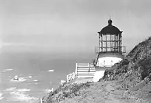 The lighthouse was a 43-foot (13 m) iron tower, sixteen-sided and double balconied, a twin to the lighthouse at Point Reyes but for the roof shape.[5] At 422 feet (129 m), the height of the light exceeded the 420 feet (128.0 m) Makapuu Point Light, making it the highest focal plane of any lighthouse in the United States.[6] The lens had been shipped in through Eureka, California and then overland to the remote location as it was too risky to ship it directly to the lighthouse.[5] Also due to the remote location, lighthouse tenders serviced the facility.[5] In 1881, three men being sent to the lighthouse were killed while attempting to land in a small boat from the tender Manzanita.[5] New dwellings were built in 1908 for the keepers, some of whom raised cows or ponies for the Ferndale to Petrolia stage coach line.[5] At least ten keepers served this lighthouse from 1869 to 1926.[5]