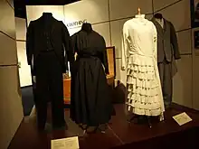 Cape dresses provide a modest double layer in the bodice area. They also provide a long, full, skirt which conceals the form and falls at least below the knee and sometimes down to the ankle, depending upon the Christian denomination. In Christianity, this practice has been followed since the times of the Early Church, immediately after the New Testament time period.[3][4][5] Cape dresses are traditionally worn by female Anabaptist Christian church members, such as Mennonite, Brethren, Amish and Charity women.[6][7] Along with the adjective kosmios (κόσμιος) meaning "modest", 1 Timothy 2:9–10 uses the Greek word catastola katastolé (καταστολῇ) for the apparel suitable for Christian females, and for this reason, women belonging to traditional Anabaptist denominations often wear a cape dress; for example, ladies who are members of the Charity Christian Fellowship (an Anabaptist denomination) wear the cape dress as the denomination teaches that "the sisters are to wear a double layered garment as the Greek word 'catastola' describes."[7] Cape dresses have additionally been worn by females who are traditional Christians of the Quaker and Shaker denominations, among others.[8]