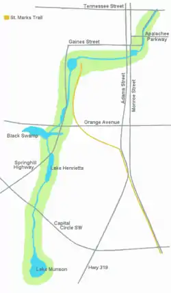 The Capital Cascade Greenway is a 6-mile (9.6 km) long greenway through downtown Tallahassee that follows the course of the St. Augustine Branch, a small creek that flows south through Cascades Park, Black Swamp, and ends in Lake Munson. The project corridor includes both public and private land.