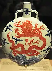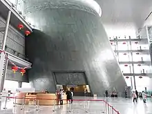 The Capital Museum's massive roof and the gradient at the entrance square is the work of architects Jean-Marie Duthilleul and Cui Kai. It was influenced by ancient Chinese architecture,[4] and the stone-made exterior wall was meant to symbolize the city walls and towers of ancient China.[4] A piece of danbi (a massive stone carved with images of dragon, phoenix and imperial artifacts) is embedded on the ground in front of the north gate of the museum. A decorative archway from the Ming Dynasty, set in the reception hall, shows the "central axis" feature that is commonly seen in Chinese architecture.[4] The Bronze Exhibition Hall, which has an oval-shape, was meant to symbolize the unearthing of ancient relics by its slanting design which extends from the ground to the exterior of the museum.[4]