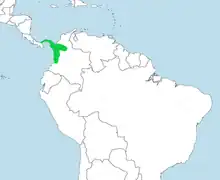 The nominate subspecies of spot-crowned barbet is found from Panama's Veraguas Province east to the Canal Zone. C. m. rubrilateralis is found from eastern Panama into Colombia, east to Antioquia Department and south to Valle Department. It usually inhabits wet primary forest in both lowands and hill country and is also found in secondary forest. It is mostly found at elevations between 600 and 900 m (2,000 and 3,000 ft) but up to 1,200 m (3,900 ft) in a few areas.[3]