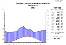 Hohenlohe is part of the warm temperate Central European climate, with still predominantly maritime character. The changing topography on a small scale, especially between valley and high altitude, also causes the climate varying greatly from place to place. The local climate of Öhringen mediates between the milder of the Neckar river basin, the somewhat rougher the Hohenlohe plain and the upland climate prevailing in the Swabian-Franconian forest mountains. Öhringen has a mean annual temperature of 8.7 °C (47.7 °F). The monthly average for January and July are on Keuper height by about one to two degrees lower. These temperature differences are especially clear in the winter, when snow still lies on the heights, but it is melted away in the plane already. The average annual precipitation is falling in Öhringen at 734 millimetres (28.9 in), in the higher areas of the Keuper forest mountains up to 1,000 millimetres (39 in) and sometimes over it. The arrival of spring, with the beginning of the apple blossoms, is around May 4 in Öhringen, further to the east later, further west earlier.[8] The German Weather Service operates a weather station in Öhringen.