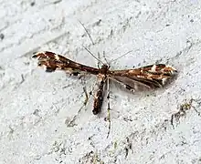 The wingspan is 18–21 mm.[2] Adults are on wing from May to August.[3] The forewings are dark reddish-fuscous, with a few white scales and indistinct whitish spots at 1/3 of disc and at the base of the first segment. There are two well-marked white bars on the segments. The cilia are mixed with black scales, banded with whitish. The hindwings are dark fuscous, the third segment with two subapical black scale-teeth in the upper cilia and suboblong subapical and small apical scale-teeth in the dorsal cilia, separated by whitish spots. The larva is pale greyish-green with darker green dorsal and subdorsal lines and brown spots and numerous whitish hairs.[4]
