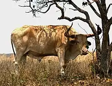 The Caracu is a Brazilian breed of beef cattle.[4] It is a Criollo breed, derived from European cattle brought to Brazil by the conquistadors; it has little or no zebuine influence.[5] It was originally a triple-purpose breed, used for draught work and transport, for meat and for milk; in the twenty-first century it is reared principally for beef, but there are also dairy lines. It has contributed to the development of a number of other breeds, among them the Caldeano.[6] It is closely similar to the Mocho Nacional, a polled breed, and it is probable that the two will be merged.