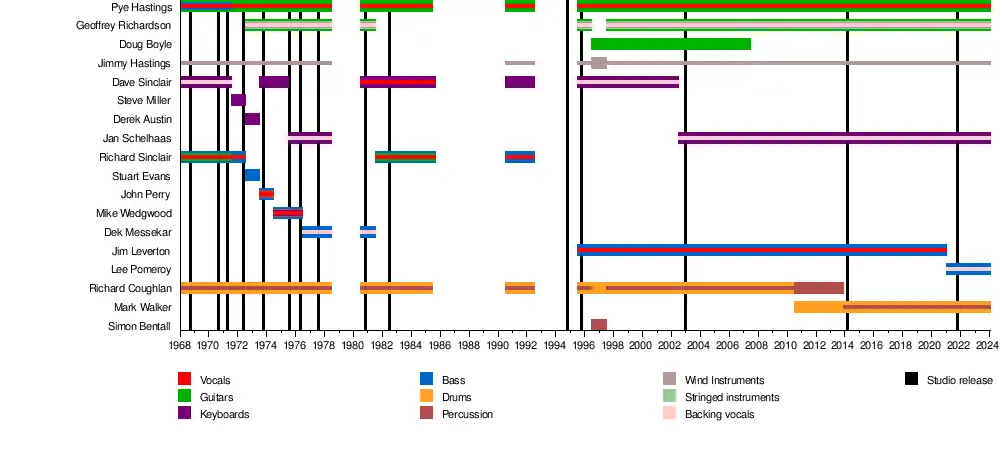 | Past members | Richard Coughlan Richard Sinclair Dave Sinclair Steve Miller Derek Austin Stuart Evans John G. Perry Mike Wedgwood Dek Messecar Doug Boyle Simon Bentall Jimmy Hastings Jim Leverton |