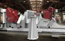 In 1994, AME developed a cost-effective pivot saw with the brand name AMSAW 200 for the US market. In 2011, AME of Rockford, IL, developed a high-efficiency carbide saw where the pivot axis of the gearbox is fixed on the lower end of the machine bed, for cutting 350 mm (14 inch) billets. The force is contained in a close loop and the machine is extremely stiff. In this machine the chip flow is also improved, as the chips are thrown directly onto the chip conveyor.