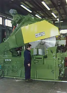 Most of the time, low backlash case-hardened gears mounted in ball-or-taper-roller bearings are used. Depending on the size of the saw blades, a maximum of five gear sets with a gear reduction of up to 40:1 can be used. Variable speed motors of up to 150 KW drive the gearbox directly or via timing or "V" belts. Many saws have the blade mounting flange integrated within the spindle. This is less expensive, but requires expensive maintenance when the blade mounting surfaces wear. However, some more innovative saws have removable drive hubs which are mounted rigidly, and can be easily replaced. Some saws also use flywheels on the input shaft of the gearbox to smooth the fluctuating torque.