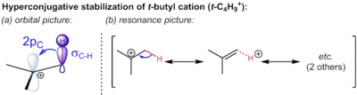 Hyperconjugation by neighboring alkyl groups stabilizes the t-butyl cation. The stabilizing interaction can be depicted as an orbital interaction or by resonance structures involving "no-bond" resonance forms. (For clarity, a dashed line is used to show that the hydrogen atom is still attached, although the formal C–H bond order in the hyperconjugative structure is zero.)