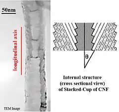 Stacked-cup carbon nanofiber: electron micrograph (left) and model (right).[1]