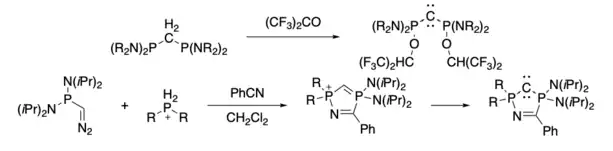 Synthetic methods have also been developed for more diverse carbodiphosphoranes.  Methylenediphosphines will undergo a reaction with hexafluoroacetone[19] or thioacetone[20] to form O-substituted and S-substituted carbodiphosphoranes respectively.  Cyclic carbodiphosphoranes have also been successfully synthesised through the reaction of bis(diisopropylamino)phosphino diazomethane with bis(dialkylamino)phosphenium triflate in excess benzonitrile followed by deprotonation with hexamethyldisilazide.[21]