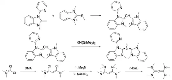 14. 1 2 3 4 Dyker, C. Adam; Lavallo, Vincent; Donnadieu, Bruno; Bertrand, Guy (2008). "Synthesis of an Extremely Bent Acyclic Allene (A "Carbodicarbene"): A Strong Donor Ligand". Angewandte Chemie International Edition. 47 (17): 3206–3209. doi:10.1002/anie.200705620. PMID 18311741.