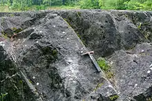 There are limited outcrops on the Isle of Man[7] and more extensive ones in Anglesey notably along the Menai Strait, around Benllech and towards Puffin Island.[8] The Carboniferous Limestone belt extends eastwards to form the Great Orme at Llandudno, the neighbouring Little Orme and a zone of country in inland Denbighshire running through Denbigh and Ruthin. A broader belt forms high ground immediately east of the Clwydian Hills extending south to form the impressive west-facing Eglwyseg escarpment north of Llangollen and continuing as a broken outcrop southwards beyond Oswestry.[9] There are a few outcrops in Shropshire such as Titterstone Clee Hill and at Little Wenlock.