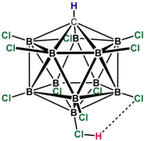 was shown to be monomeric in the gas phase, with the acidic proton (shown in red) bound to Cl(12) and secondarily bonded to Cl(7). The monomeric form is metastable when condensed, but eventually polymerizes to give a structure with the acid proton bridging between carborane units.[10] (N.B.: The lines between the carbon and boron atoms of the carborane core show connectivity but should not be interpreted to be single bonds. The bond orders are less than one, due to electron deficiency.)