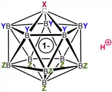 (X, Y, Z = H, Alk, F, Cl, Br, CF3) are a class of superacids,[1] some of which are estimated to be at least one million times stronger than 100% pure sulfuric acid in terms of their Hammett acidity function values (H0 ≤ –18) and possess computed pKa values well below –20, establishing them as some of the strongest known Brønsted acids.[2][3][4] The best-studied example is the highly chlorinated derivative H(CHB