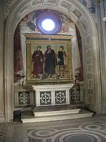 Linda Koch has suggested that the overall architectural design and decoration of the chapel represented an attempt to evoke Early Christianity, and was much influenced by the imperially sponsored churches of Ravenna.[20] In terms of the altarpiece, apart from the unusual general richness of the saints' clothing, and their rather static poses, each stands on a rota or circle of the most valuable and luxurious architectural stones, from the left: serpentine, porphyry, and a "mottled tan marble". These echo the rotae of real porphyry on the Cosmatesque floor of the chapel, and in the tomb on the surface below the sarcophagus, and evoke imperial monuments of the ancient past.[21]